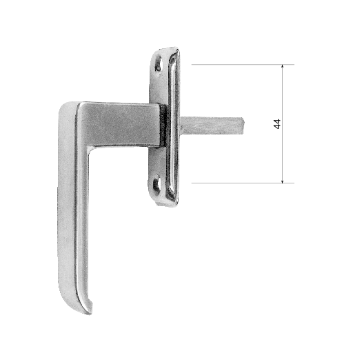 Aliuminė cinkuota langų rankenėlė (be mechanizmo).Atstumas tarp tvirtinimo varžtų 44mm.